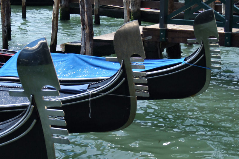 Bug und Heck der Gondeln schmückt eine stilisierte Dogenmütze. Sechs Zacken für die sechs Stadtteile. Die Gondeln sind übrigens gekrümmt gebaut, damit sie mit nur einem ja eher seitlich angebrachtem Ruder trotzdem ordentlich geradeaus laufen